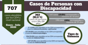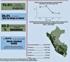 Los Centros de Emergencia Mujer del Ministerio de la Mujer y Poblaciones Vulnerables señalan haber atendido 707 casos, de enero-julio 2020, de los cuales el 74,8% son mujeres y por tanto 25.2% son hombres. Luego 362 personas con discapacidad que han sufrido violencia son de 18 a 59 años. Al colocarme mis “lentes de género” veo que sobre estos 362 casos no explica ¿cuántos casos son mujeres y cuantos hombres?